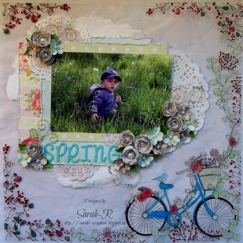 Today, I'm sharing the details and close-ups of one of the layouts I created with the gorgeous ScrapThat! Spring into May Anniversary Kit. Today's layout is simply called "Spring" and features a picture of my son from last Spring (since this year, it seems, Spring decided to take its sweet time getting here and I couldn't get a decent Spring picture to use). I loved the KaiserCraft transparency included in this kit and used it as the base page for this layout. I coloured the transparency with Copic Markers - so cool how this turned out. Pictures of the layout are taken on a white background but it looks so much cooler in real life!