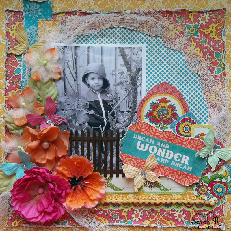 I (obviously) didn't want to hide too much of the background that I painstakingly created, so I focused my photo cluster in one corner of the layout, with a small embellishment cluster in the opposite corner. As the 'mat' for my photo element, I used part of an Imaginarium Designs 12x12 Moroccan Chipboard Shape, plus some of the cut-outs from the shape, which I painted Solar Gold. I cut the floral flourishes from the Graphic 45 Bohemian Bazaar papers and highlighted the dots on the flourishes with Stickles in Patina. The 'mesh' elements are actually the backing off some leftover bathroom tiles. I also added some tangles of white cotton thread. The title "Live. Love. Laugh." is the Kaisercraft Wood Flourish from the Embellishment Add-on, which I painted with Luminarte Silks in Bolivian Blue. Finally, on the right side of the photo, you see Mandy's gorgeous stick-pin, which so perfectly coordinates with the colours in this kit!